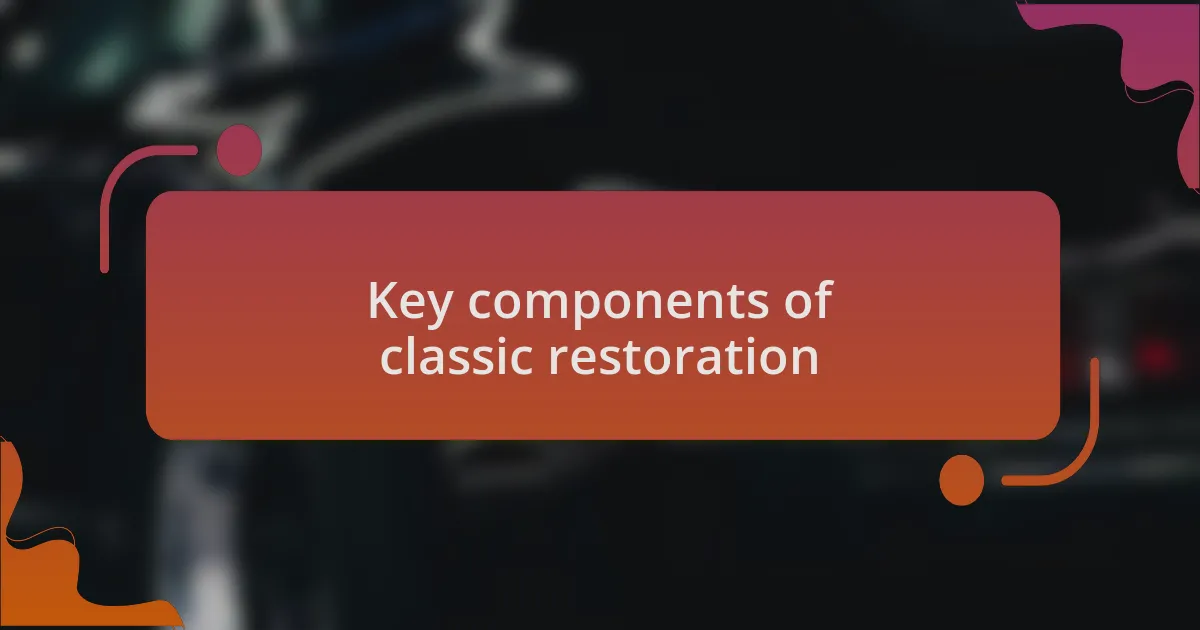 When diving into classic restoration, understanding the key components is essential for success. For me, it all begins with the foundation—assessing the vehicle’s frame and bodywork. During my first restoration project, I underestimated how warped the frame could be. After investing time realigning it, I understood the importance of a solid starting point, which truly set the tone for the entire build.